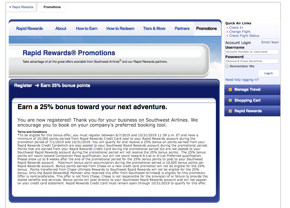 - Register between 6/7/2019 and 10/31/2019 11:59 p.m. ET and have a minimum of 20,000 points earned from Rapid Rewards Credit Card post during the promotion period of 7/1/2019 and 10/31/2019.