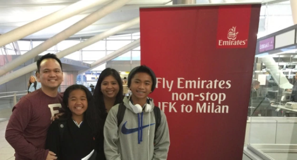 My family before we boarded our Emirates flight from JFK to Milan, we paid $399 per person round trip.