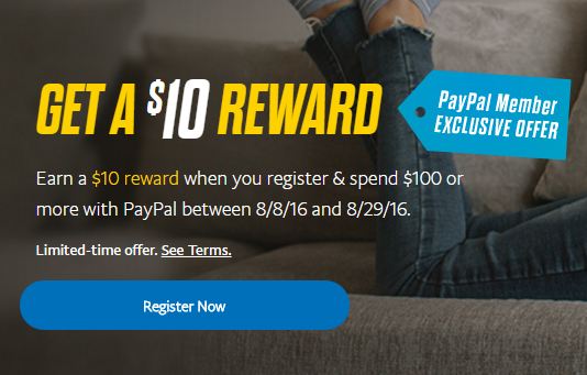 Thanks to Miles to Memories, I learned about a PayPal promotion where you can get a $10 reward after you register for the promotion and spend $100 with Paypal. It runs through August 29th and does not appear to be targeted.