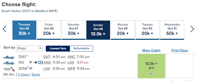 Oddly, the one flight I could find from Dutch Harbor to Medford, Oregon for 12,500 miles included a segment on American Airlines: