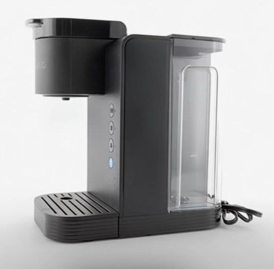 a black coffee maker with a plastic container