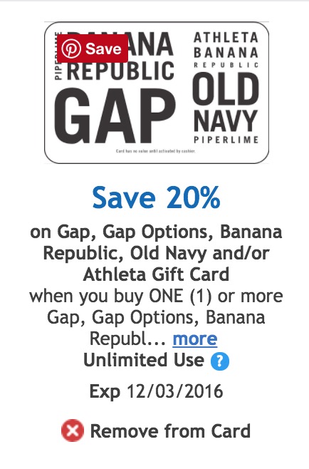 It runs through 12/3 and says “unlimited use” but based on last year’s experience I believe that is only “unlimited use” on one purchase. Â Meaning you can use it and 20% will come off each Gap gift card on your order, but once you’ve used the coupon, it’s done. Â If you have data points on that this year, let me know in the comments