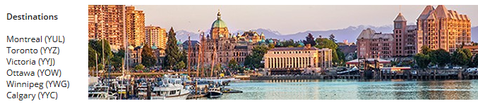 - Destinations include the following six cities in Canada: