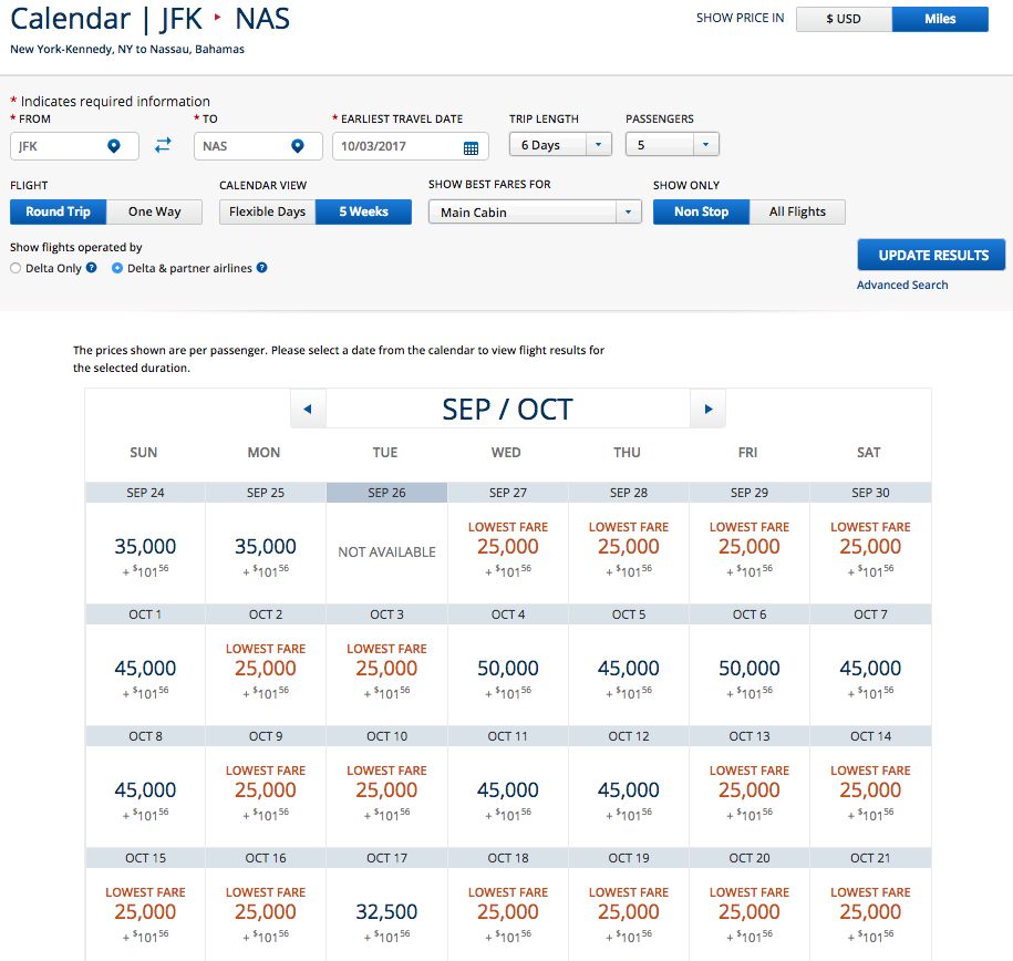 I decided to look up availability for a family of five between New York JFK and Nassau Bahamas using Delta’s low fare calendar. Availability is plenty, but the lowest price is 25,000 miles round trip.