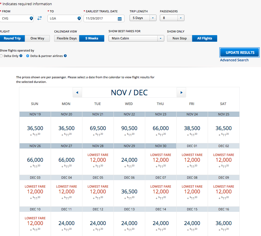 I decided to look up availability for a family of four for a 6-day trip from San Francisco to New York, using Delta’s low fare calendar. Availability is quite good with the exception of Thanksgiving week, which is expected.