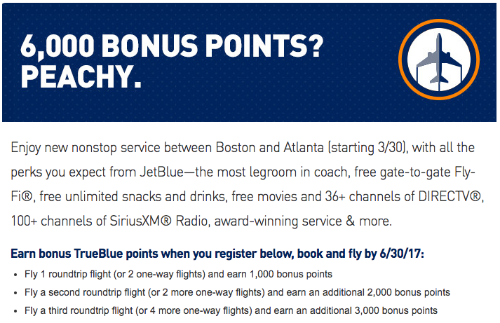 If you’re new to jetBlue, now would be the time to create a TrueBlue account. If you live in Boston, and take advantage of the Boston-Atlanta deal, you could earn a ton of points! Here’s how: