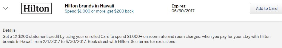 This offer is also targeted. I have it on my Amex Hilton card, and a couple other cards that earns Membership Rewards points. If you are staying at the Hilton Hawaiian Village in Waikiki or Waikoloa, it’s possible that you can stack this offer and the one above.