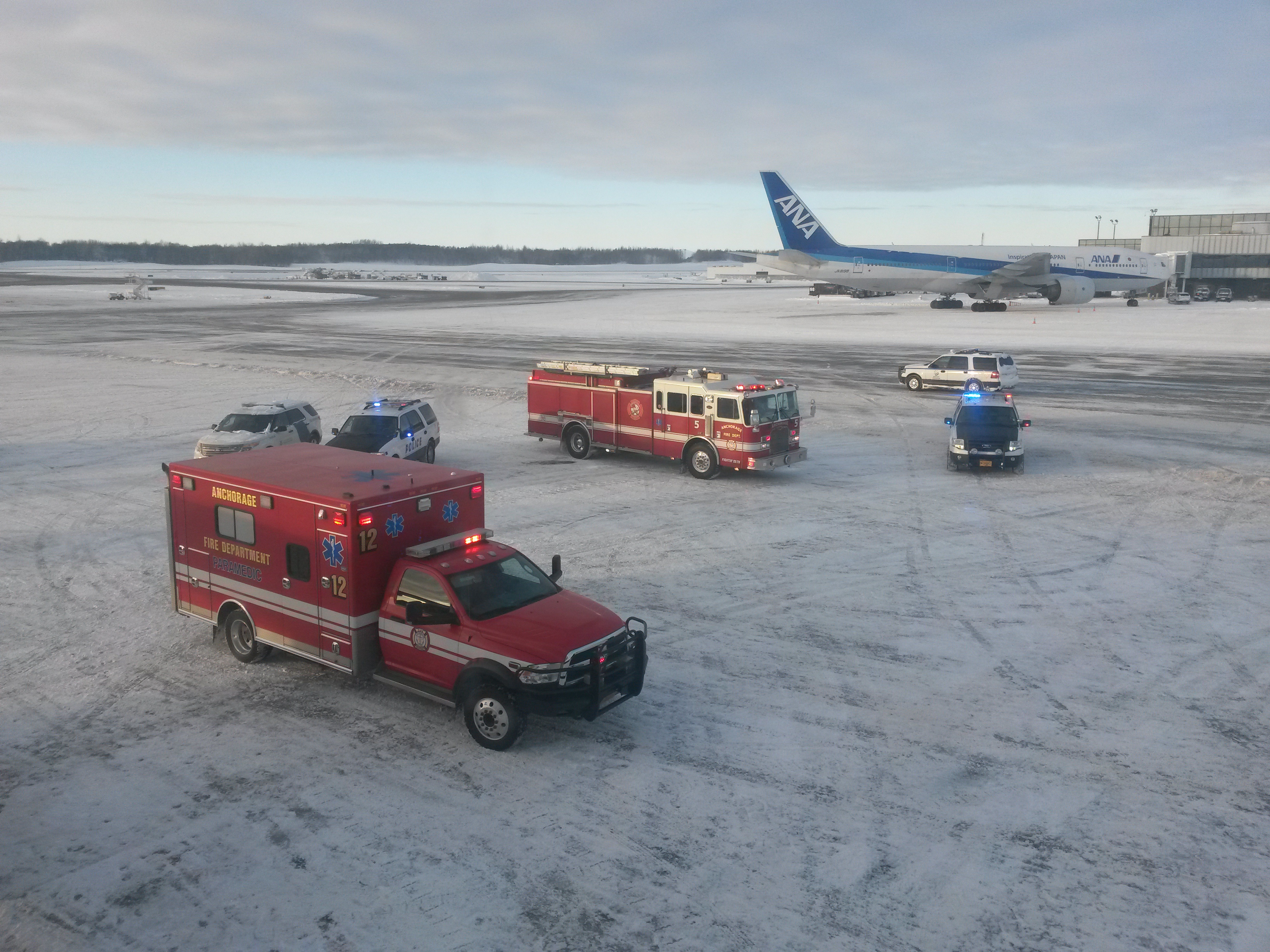We landed in Anchorage without incident, and there were fire trucks and medical personnel waiting for us. The woman was transported off the plane by a paramedic crew and rushed to the hospital. No baby was born in the air, but it was certainly coming today!