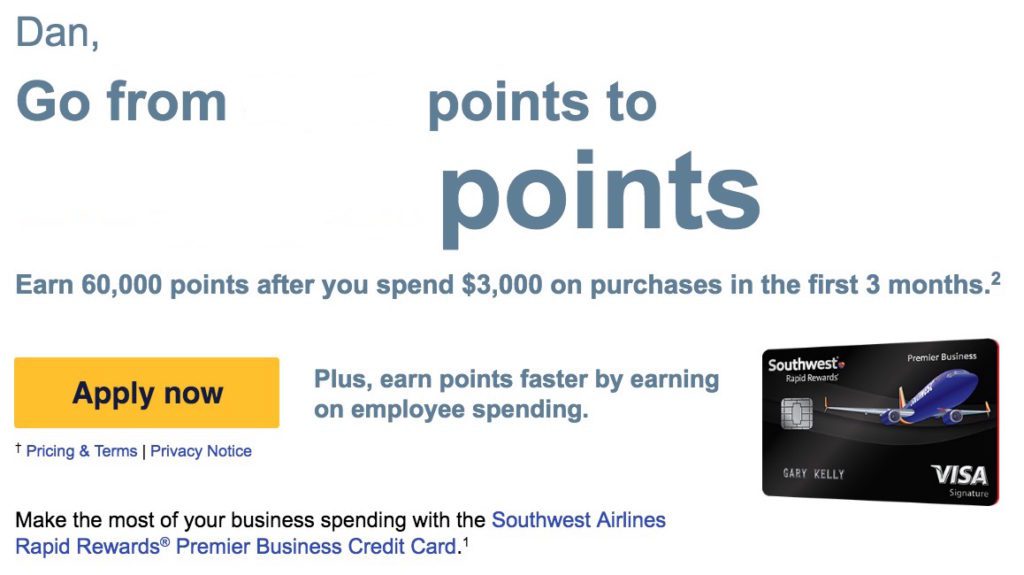 The typical offer on the Southwest Business card is 50,000 points – I was emailed an offer for 60,000 miles