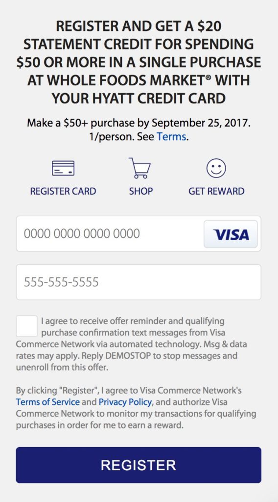 - Register before using your Hyatt Credit Card to shop at any Whole Foods Market in the U.S. and get a $20 statement credit for spending $50 or more in a single purchase at Whole Foods with your Hyatt Credit Card between August 14, 2017 to September 25, 2017.