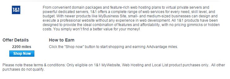 An enterprising redditor has found what appears to be a pretty great deal through various shopping portals.  You can get 2200 American AAdvantage miles for a purchase at web hoster 1&1 through the American shopping portal.