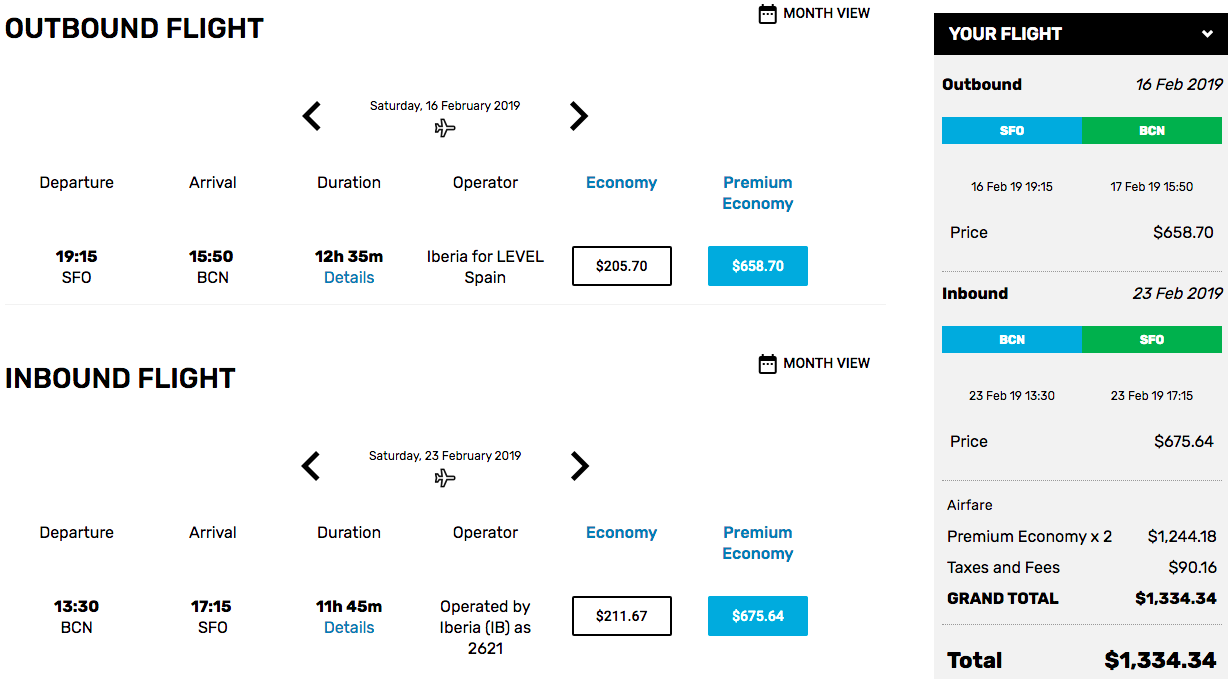 - Spend 63,500 Avios plus $203.94 in Premium Economy on Level‘s nonstop flight between SFO and Barcelona during our ski week in February, compare to cash fare of $1,334.