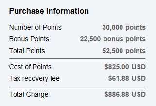 If I buy 30,000 points (the most you can buy in this promotion), I’d get an additional 22,500 points. So a total of 52,500 points for about $887 including taxes. That’s an average of 1.69 cents per point, about the same as JetBlue’s last 70% buy-point bonus promotion.