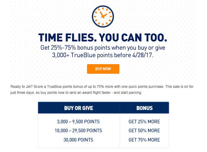 Up until now I rarely fly JetBlue, because they just don’t have flights from the Bay Area to places I need to be. But so far this year, I have taken two JetBlue flights, one to Long Beach for Disneyland and the other to New York for the Hamilton show. I also have a MINT flight booked for the whole family at the end of the year. Needless to say I am paying a little bit more attention to JetBlue and their TrueBlue program. This morning I got an email that really grabbed my attention. For 3 days only, you can purchase TrueBlue points with up to 75% bonus.