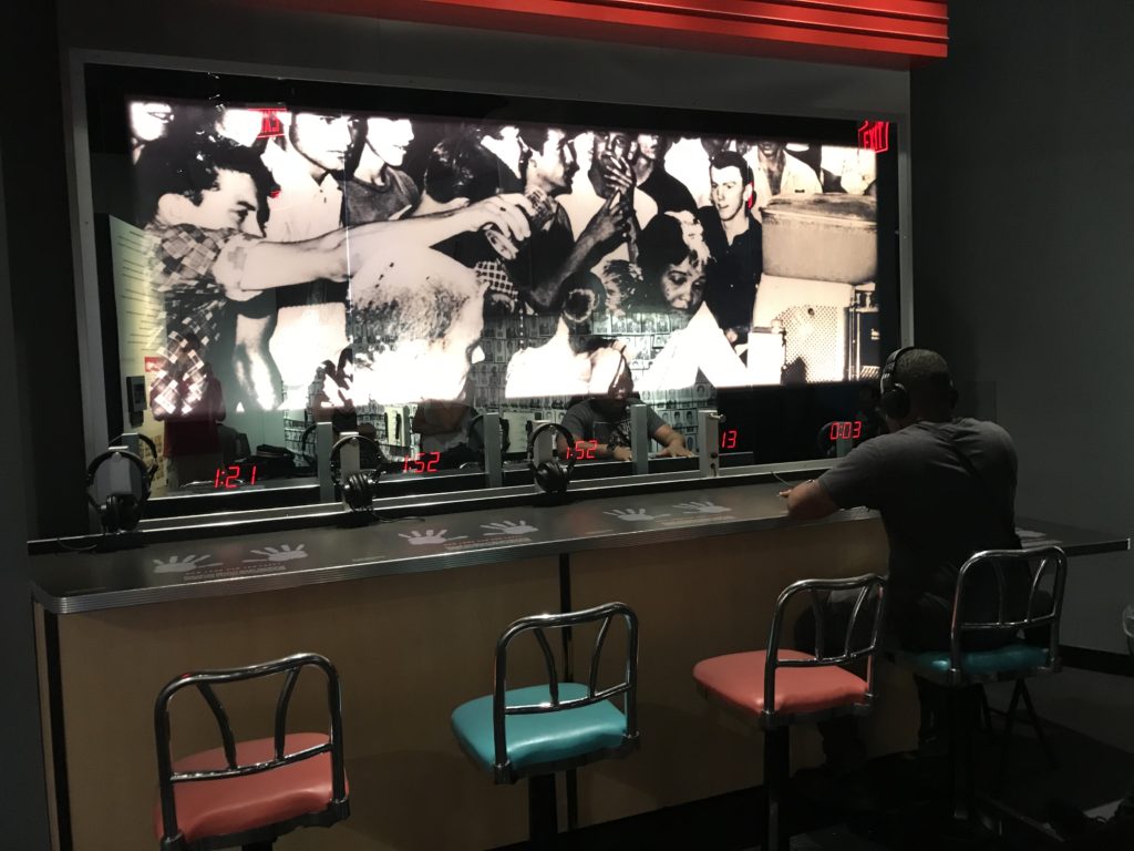 You have to put on headphones, close your eyes, and imagine yourself in the situation while a track of harassment and insults plays in your ears. The goal is to see how long you can remain calm, keeping your palms flat on the counter in front of you. While this is far from the real experience of so many (it is easy to tell yourself that there really isn’t anyone threatening you), it does allow you to begin to understand the pressure the civil rights activists had to withstand.