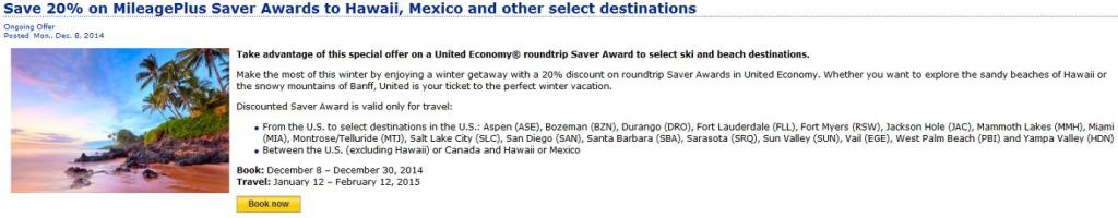 An official promo from United is offering 20% off to Hawaii, Mexico and what United calls “ski and beach” destinations.