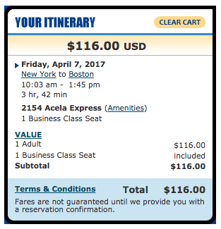 Two of the four above are pretty easy to use: if you book an Acela ticket on amtrak.com, you’ll earn an additional 400 points. Take this sample trip below: