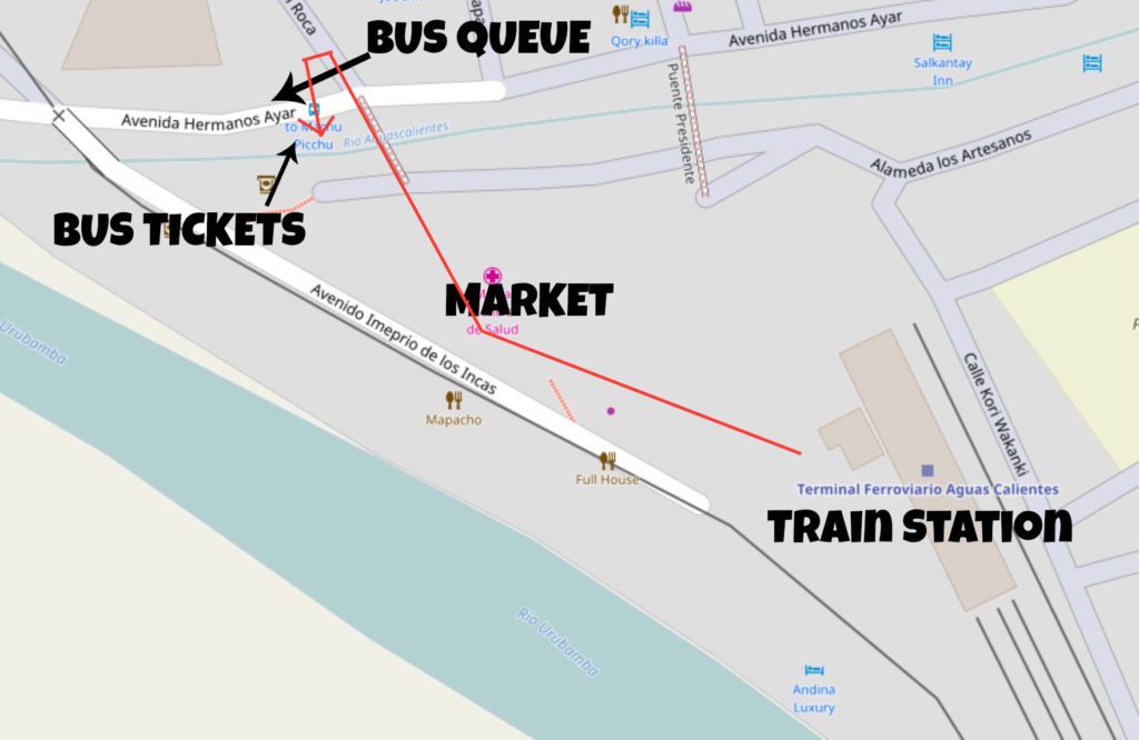 When you get to the town of Machu Picchu Pueblo (Aguas Calientes), you’ll leave the train station, walk straight through a giant covered market filled with people selling touristy things. That will put you in the town itself, where you’ll cross a bridge over the Urubamba River, take an immediate U-turn down to the street itself. That will put you right at the place you need to be to buy your bus tickets to go up to Machu Picchu itself. Here’s an annotated map – base map copyright OpenStreetMap contributors