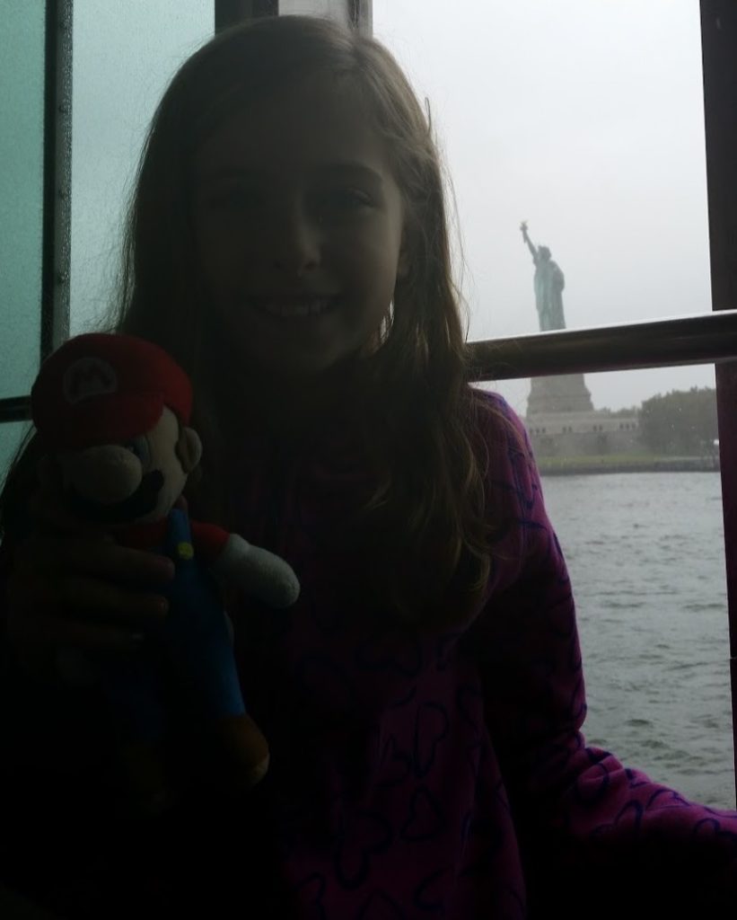 Third we went to the Statue of Liberty. A few things that make the Statue of Liberty so cool is that it used to be a beautiful shade of copper but a lot of bad weather turned it green. Also the Statue of Liberty was a generous gift from France. The Statue of Liberty is located on Ellis Island, so it’s surrounded by water! Here’s a picture of our family mascot Mario and I with the Statue of Liberty. It’s kind of dark – maybe my Dad should take photography lessons!