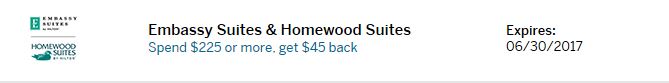 Embassy Suites & Homewood Suites, Spend $225 by 6/30/17 and get $45 back.