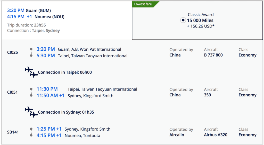 This one is super weird. Due to the odd FlyingBlue award regions and the fact that FlyingBlue doesn’t always charge the higher price for transiting additional regions, you have a steal on your hands for getting to Noumea, New Caledonia.