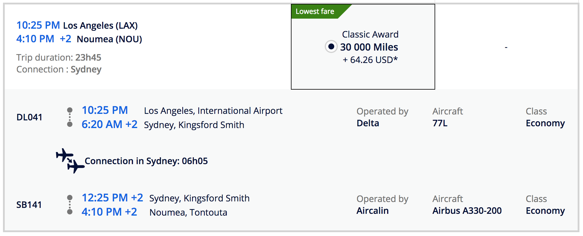 Slap on the extra leg to Noumea, and now you’re only looking at 30,000 miles. That is quite a deal. Even the fees are a reasonable $65.