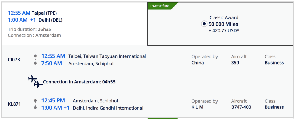This routing works from a large number of East Asia origins, not just Taipei to Delhi, as there are a number of SkyTeam partner options. With this routing, you’ll only pay 50,000 miles for the trip in business class, which is much less than the 75,000 miles required for flying the single leg from Asia to Europe!