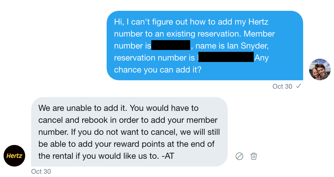 Since I couldn’t find a place to do it online, I figured asking Hertz via Twitter would be the way to go to add my Gold number to a reservation.
