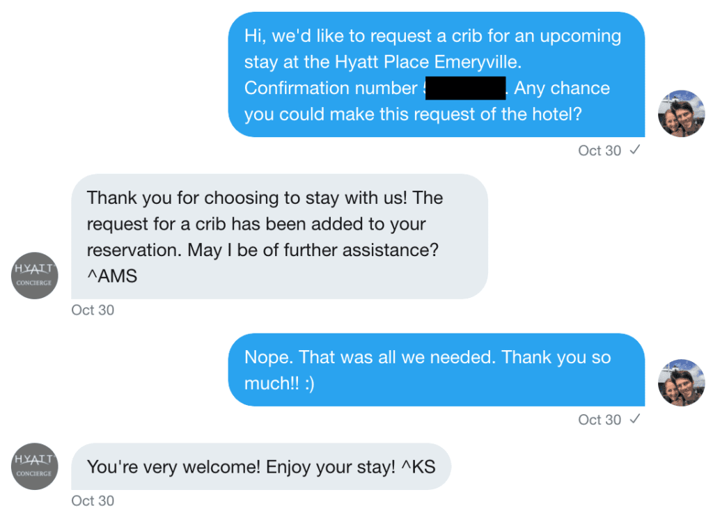 Twitter is becoming a quick go-to for me when I need minor assistance with a reservation, or have another general question. If the need is urgent, I’ll obviously pick up the phone and call them. But given that this typically requires navigation of phone menus, hold times, and a lot more effort, Twitter is preferred when possible for quick customer service.