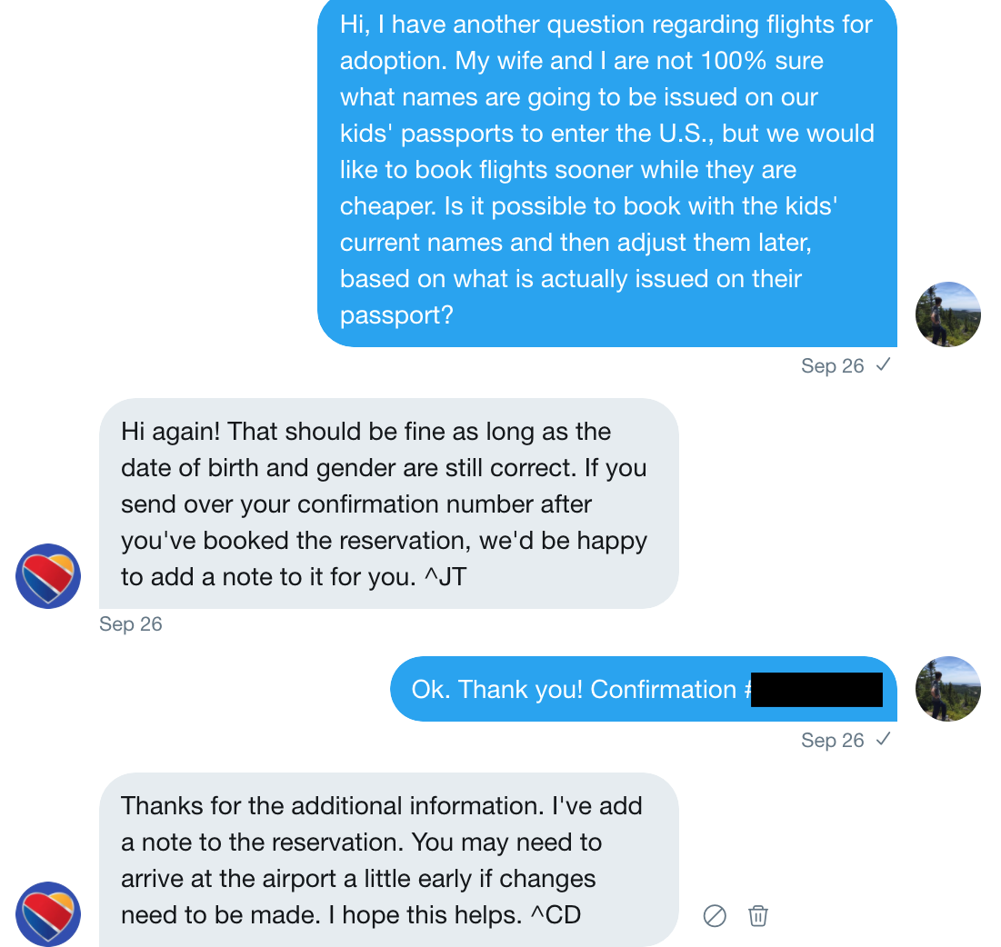 So I reached out to Southwest about the name change, explaining our unique situation with adoption. I got an answer in less than 10 minutes. The agent told me that they could add a note to the reservation and that we could process the name change at the airport with their documentation. I had the tickets booked within the hour.