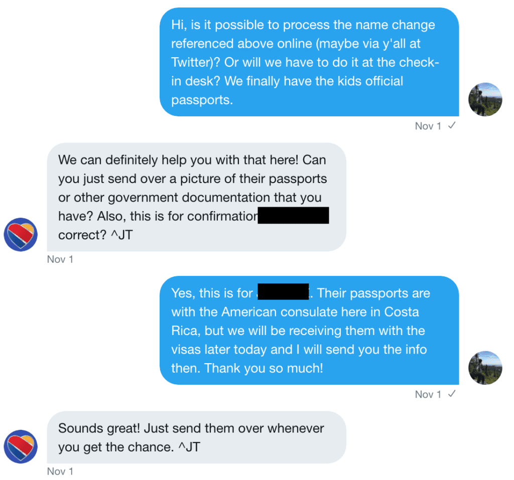 Second round: a few days before our flights, I sent another message asking if a rep could process the name changes ahead of time. The answer was affirmative, and I sent pics of our kids’ passports to the rep. Within minutes, he had the names changed. He fat fingered a letter and I had to ask for a second change, which was no problem either. All said and done, Southwest allowed us to save a bundle on our return flights from Costa Rica.
