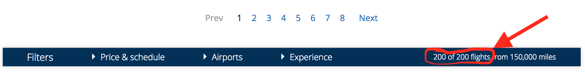 Unlike when you try to use your disAAdvantage miles, you can actually suffer from too many options when searching United award flights. I have this theory that the United award search engine caps out at 200 options. It’s like an arbitrary line where the computer decides it has found enough options for you.