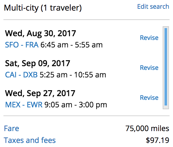This ticket prices out at 75,000 + taxes and fees. The outbound is in business on United metal for 57,500 miles, and the return is in economy for 17,500 miles. The segment from Cairo to Dubai (entirely within the Middle East zone) is free, and in business class.