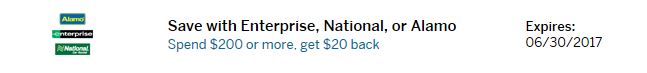 - Offer valid for bookings made online at partners.rentalcar.com/amexehi/, enterprise.com, nationalcar.com, alamo.com, via mobile app, or at any participating location in the US and US Territories.