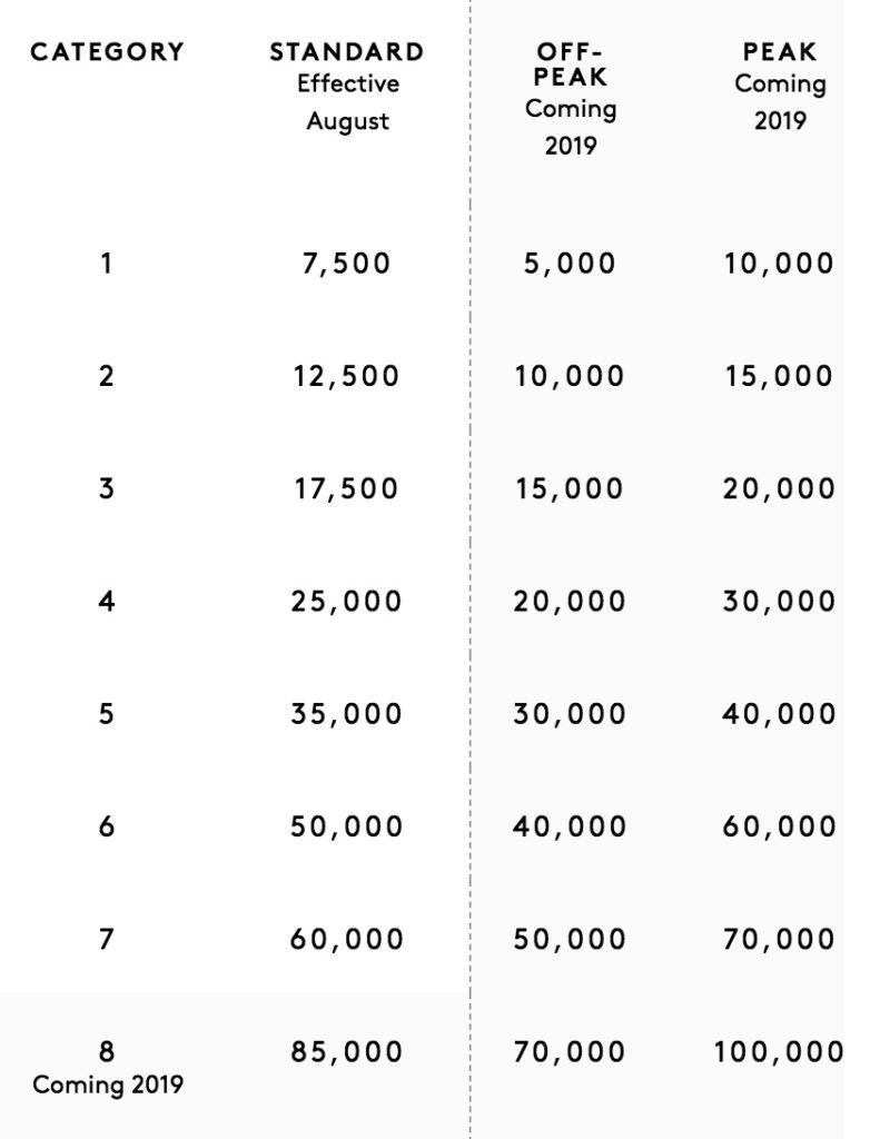 With the new changes comes a new award chart. Hotels will now fall within the category 1-7 range with category 8 being added in 2019. As of now, we don’t know where any specific hotels will land.