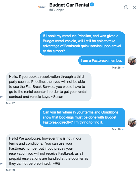 I pointed out that Budget should specify that for Fastbreak benefits to work, the car rental must be booked directly with Budget. I left the Twitter conversation at that.
