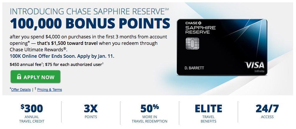 Well, you know what they say about all good things. Today, we learned via Mommy Points that Chase would be ending the 100,000 Ultimate Reward sign-up bonus associated with the Chase Sapphire Reserve. And unlike the recent Southwest Airlines Companion Pass surprise, Chase has given consumer another week to apply, as the bonus will continue to exist online until January 12th, and then in-branch for a few weeks after that. After the 12th, the bonus will be the same as the Chase Sapphire Preferred: 50,000 Ultimate Reward points.