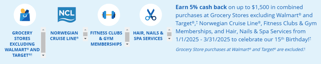 - 5% cash back on up to $1,500 in combined purchases in bonus categories each quarter you activate