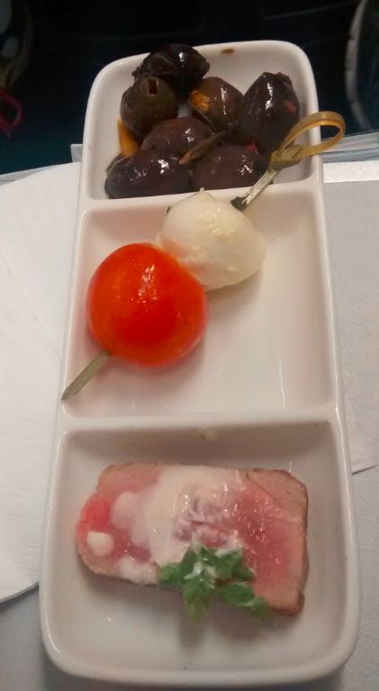 Everyone boards, and the flight attendant comes by with champagne (we don’t drink, so we took an orange juice). But then there’s a slight malfunction with the door to the plane. It is shutting, but the sensors say it isn’t. No matter, we start watching Tomorrowland on the in-flight entertainment.
