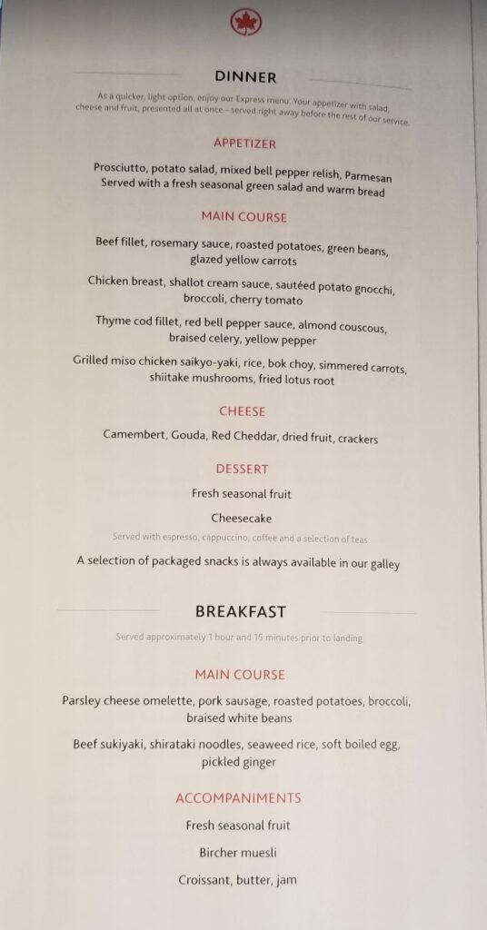 Before I get to a review of the food on my Air Canada Dreamliner Business Class flight, here are shots of the menu that was presented onboard.