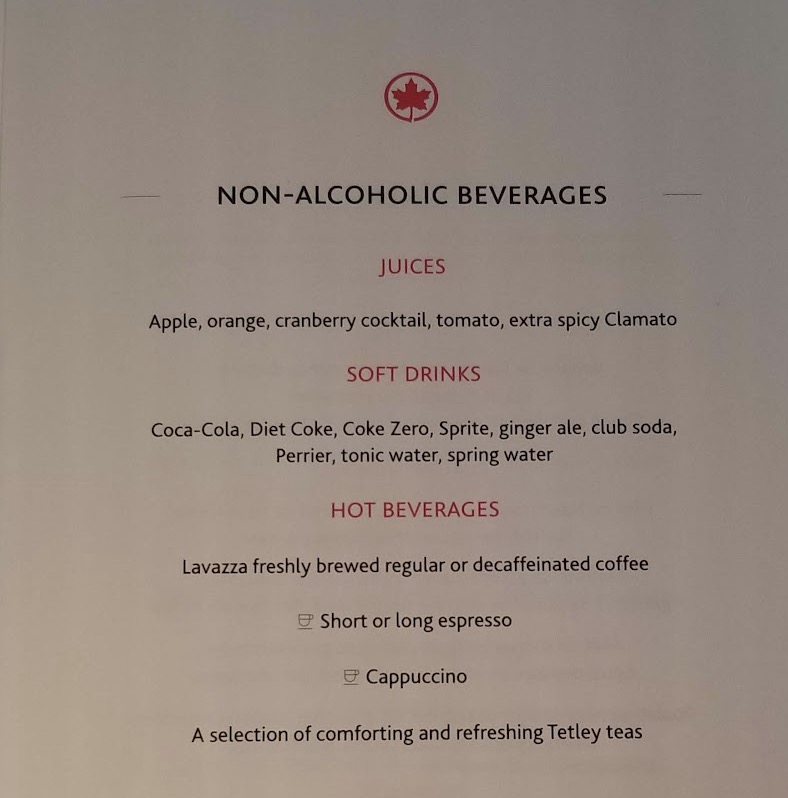 Air Canada Boeing 787-9 Dreamliner Business Class Menu