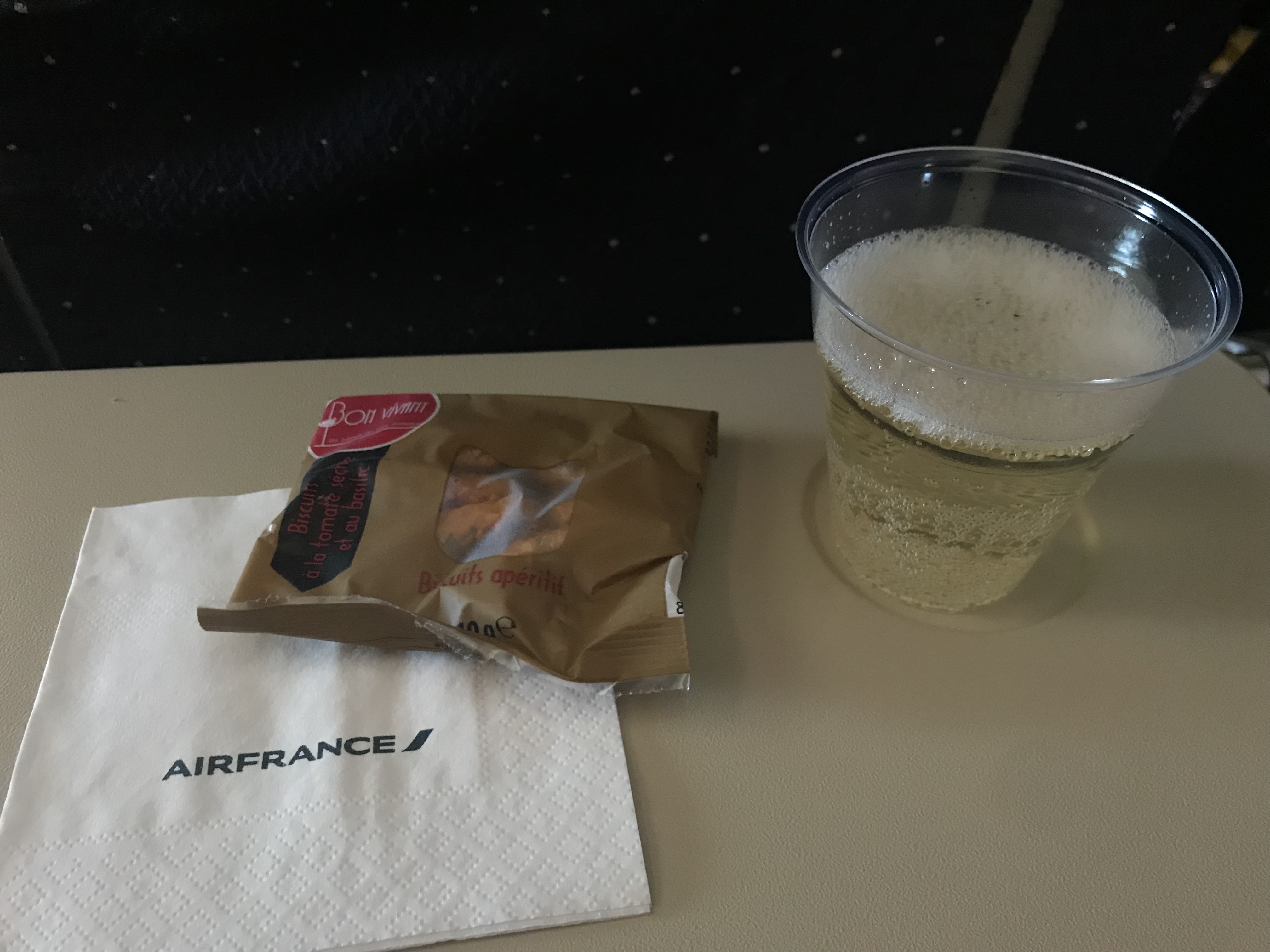 Meal service started with an aperitif of champagne and tiny bag of biscuits about 40 minutes into the flight. Having never had champagne before, I decided to give it a try. When in France. 😉 It made me super sleepy.