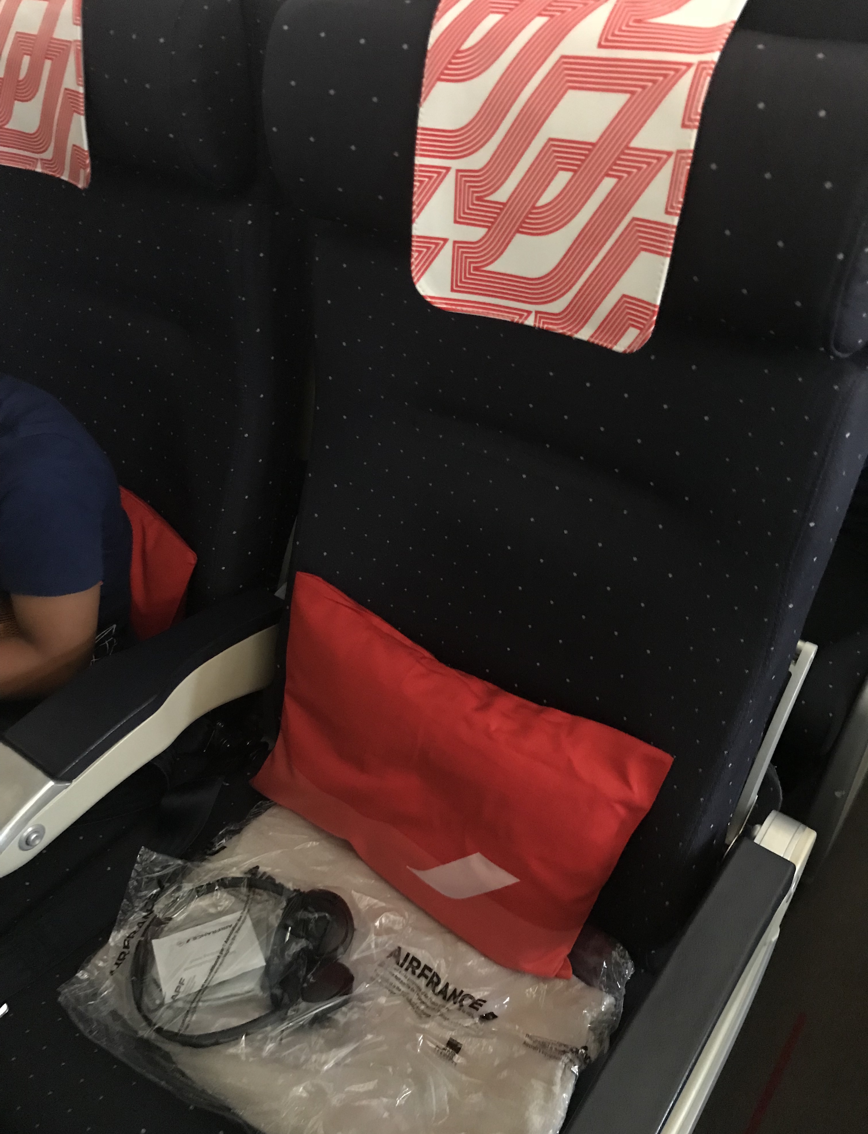 The Air France cabin interior features dark blue seats with red and white accents, mimicking the French Tricolore. Each economy seat had a red pillow, a blanket and a headphone/sleep kit typical of long-haul flights.