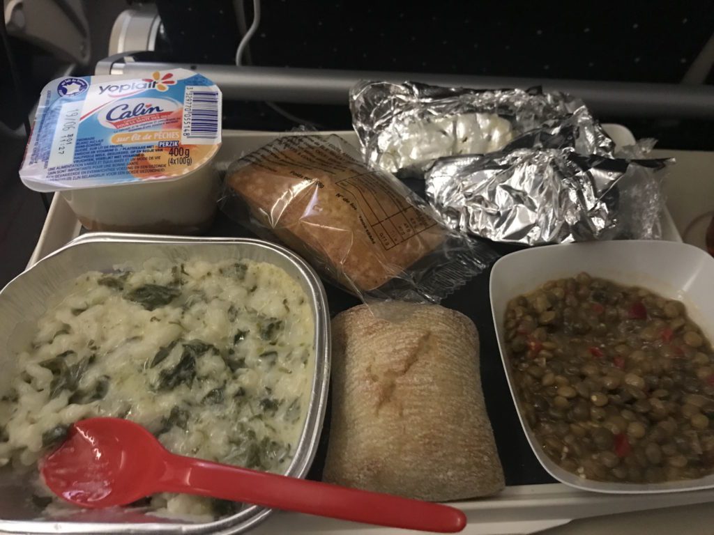 The cabin stayed dark until about 90 minutes before landing when the second meal service began. The second meal consisted of a lentil salad, spinach risotto, and a cup of liquid quark cheese (???) and fruit.