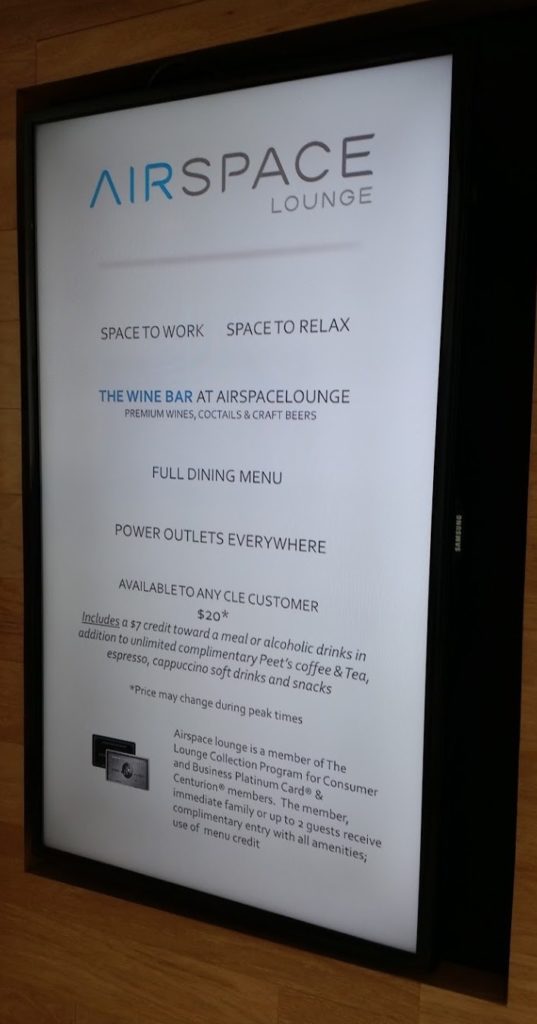 If you don’t have one of those cards, you can pay $20 for a day pass. Â All admissions come with a $7 food and drink credit. Â As I read the sign, unlike the American Express Centurion lounges, ALL immediate family (or up to 2 guests) would get admission AND the food credit. #2ndkidsmatter