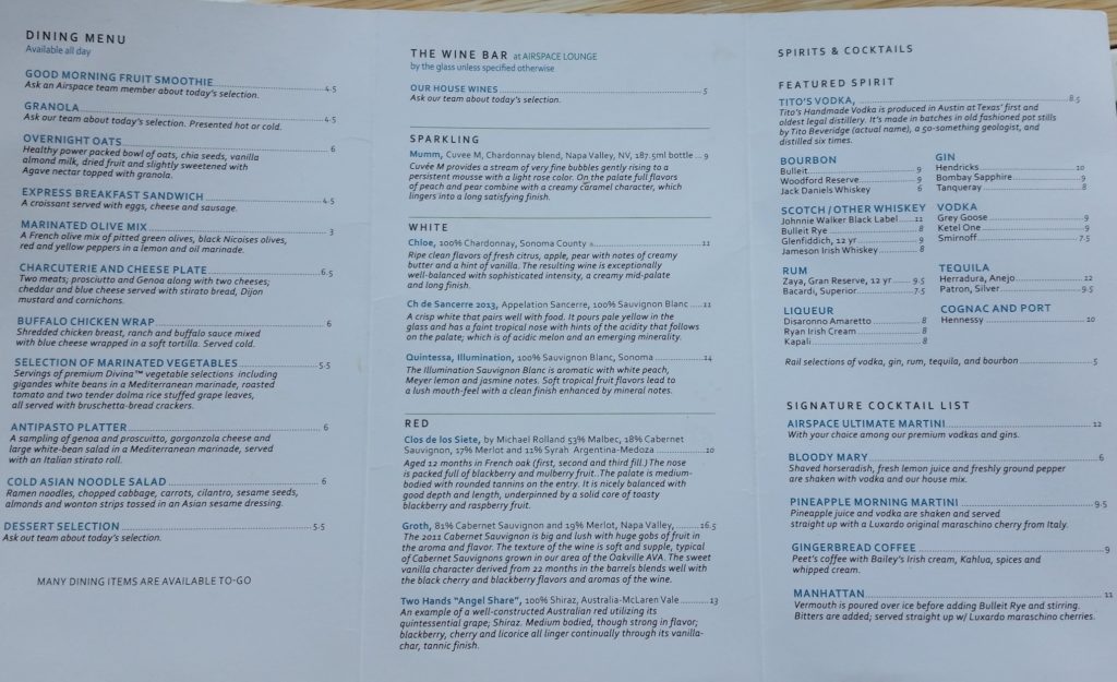 As I mentioned, you get a $7 food and drink credit with each lounge admission (even free ones you get from having an American Express card). Â I was slightly disappointed because the agent checking me in referred to it as a “drink” credit, and since we don’t drink alcohol, I thought it would be wasted. Â But the menu has a variety of food options as well and priced so that it will cover pretty much one of any item.