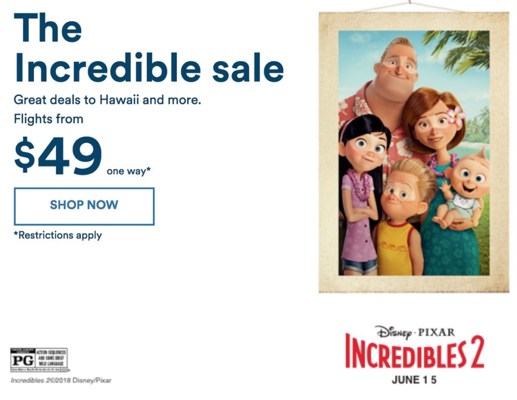 Just like Southwest, Alaska is also having a fare sale. You can find details here, and this sale is good through June 21st. This one is themed / sponsored by the Incredibles 2 movie, and has flights as low as $49 one way.