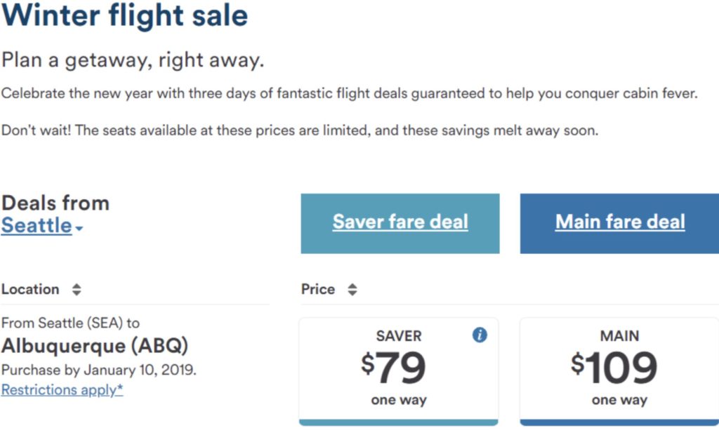 Earlier I told you about JetBlue’s flash sale. Hot on their heels is Alaska’s Winter Sale with flights as low as $39, for travel through 3/13/19. Saver fares (Alaska’s “basic economy”) during this sale include carry-on bags and 100% award miles for miles flown, a good deal for loyalists. However, this is also a flash sale: tickets must be purchased by 11:59 PM Pacific Time on 1/10/19.
