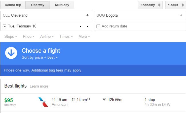 Here’s an example of a $95 one-way from Cleveland to Bogota.