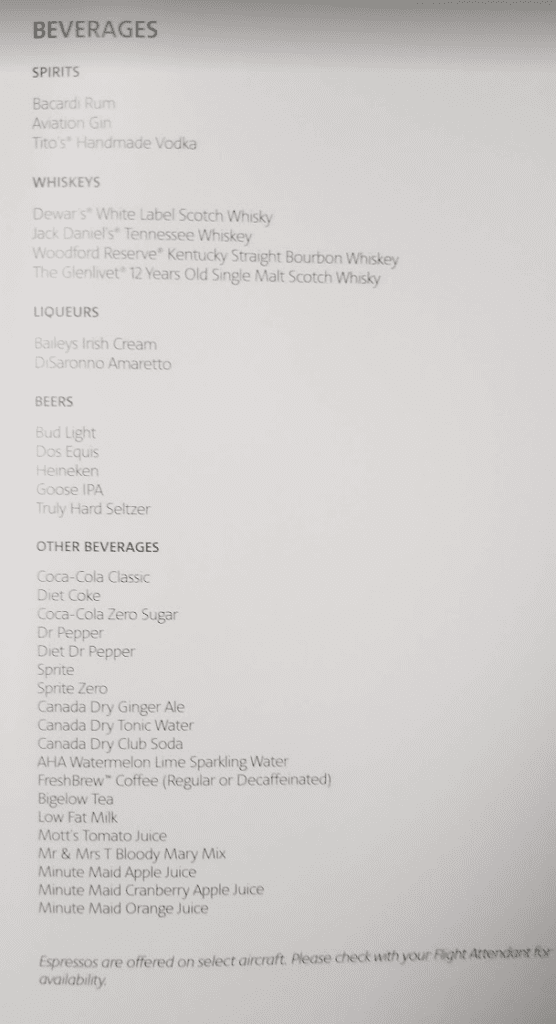 There was also a page listing the different beverages available. I don’t drink alcohol, so this is not super exciting for me personally, but I know that many people look for the alcohol selection when selecting a business class flight.